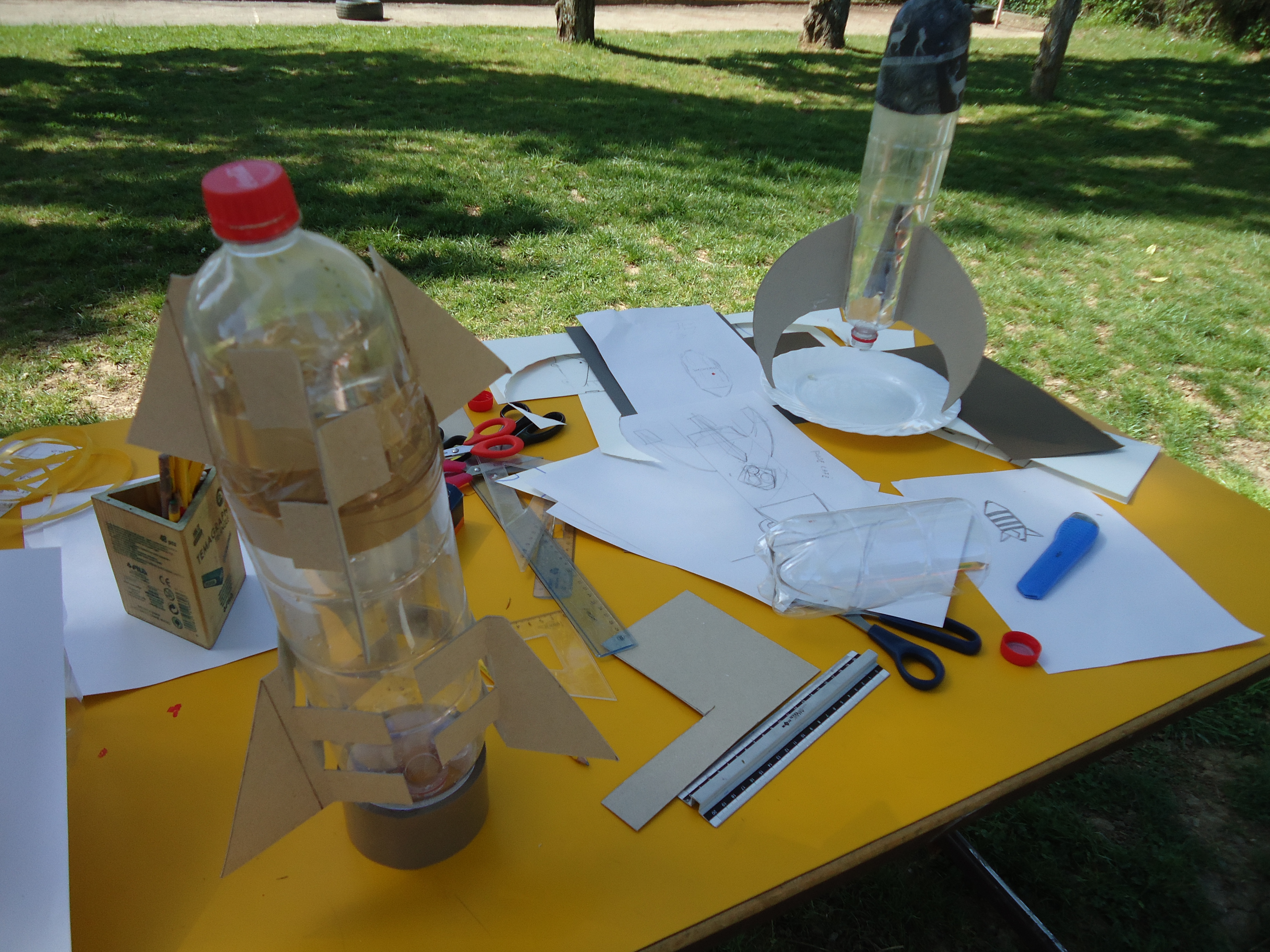 Comme presque toutes les autres choses dans la vie nos fusils, eux, ont aussi commencé avec des idées, l’imagination, feutres et papier. Un croquis a été dessiné, pour le réaliser plus tard avec des matériaux. La base de la fusée était une bouteille de 2 litres. Elle a été transformé individuelle dans des fusées high-tech : des ailes, la pointe, les poids, la taille, des parachutes… Il n’y avait pas de limites à l’imagination. Après une bonne demi-heure, les premières fusées étaient prêtes et les tests pourraient commencer…