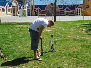 Die Flaschen wurden zu einem Viertel mit Wasser gefüllt und auf eine Startvorrichtung angebracht. Danach wird mit einer Pumpe Luft hinengepumpt, um den Druck zu erhöhen. Im ersten Durchgang testeten wir mit 2 Bar. Hier trennte sich schon die Spreu vom Weizen: Einige Raketen kamen gut in die Luft und zeigten eine solide Vorstellung. Andere kamen gar nicht erst zum Start: es wurde kein Druck aufgebaut, Luft entwisch. Fehlkonstruktionen. Fehler war, dass die Colaflasche beim Werkeln nicht ganz gelassen wurde und so am Ende nicht mehr dicht war. Über die die Flugdauer, -höhe, -weise und –eigenschaften wurde genau Protokoll geführt um am Ende die Raketen zu vergleichen. Die deutsche Rakete Sputnik erzielte hier das beste Ergebnis und blieb am längsten in der Luft und landete in guter Höhe in einem Baum…