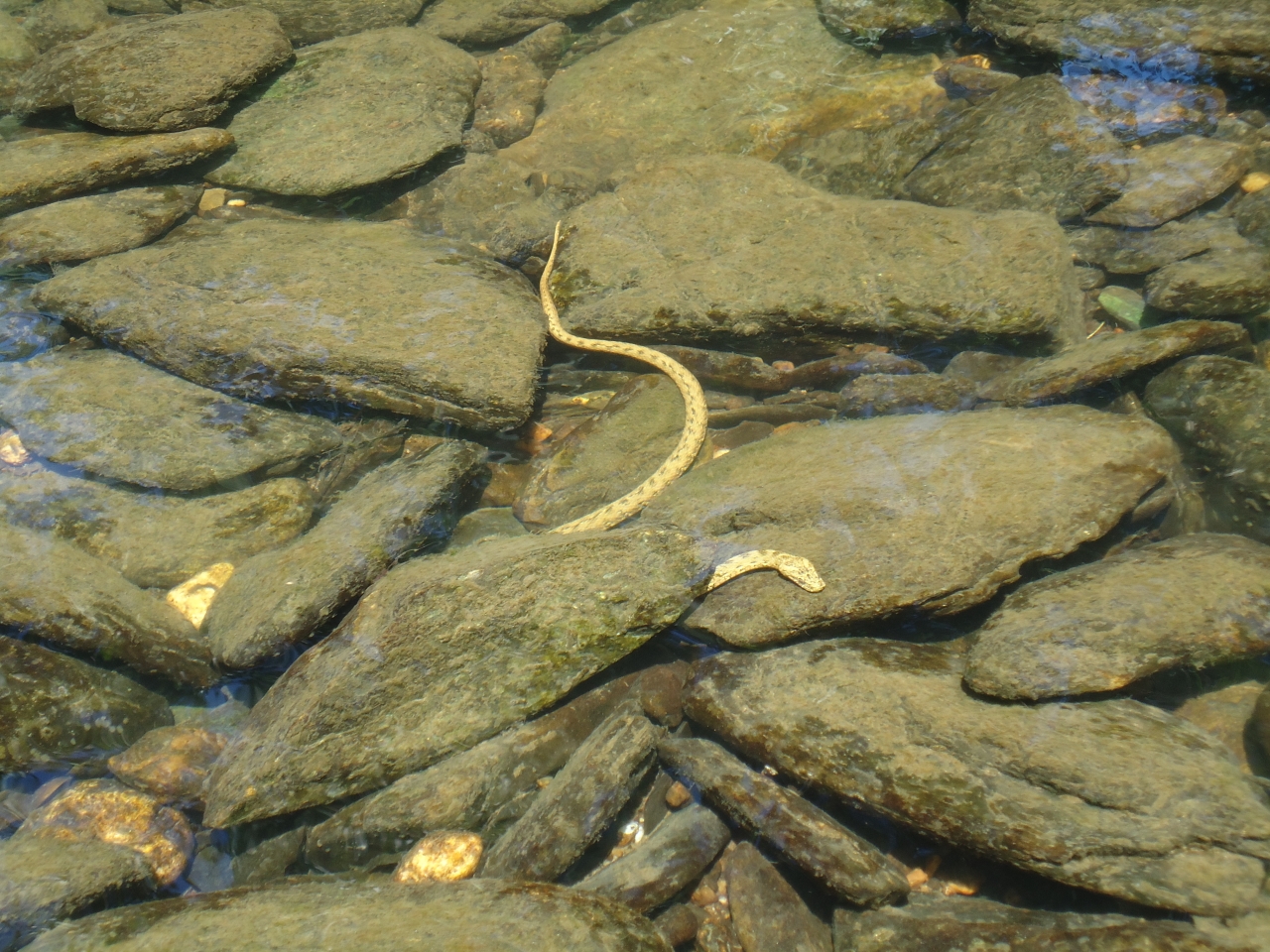 Zum Abkühlen ging es dann 20 m weiter ins Wasser. Das mussten wir uns jedoch mit einer Schlange teilen, die wie wir aus den heißen Temperaturen das Beste machte: ein erfrischendes Bad im kühlen Nass.