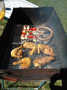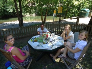 und nach einer ausgiebigen Pitataschen-Kräfteauffüllung waren dann auch schnell die Augen zu. Am nächsten Tag stand bei super Sonnenwetter dann Kathis Wohnort Burlats auf dem Programm. Auf dem Grundstück ihrer Arbeitsstelle, dem „Moulin des Sittelles“, wurde schnell ein Grill errichtet und ein Feuer entfacht. Dann bruzelten eine halbe Stunde später schon die Spieße, Würstchen und Hähnchen auf dem Grill =)