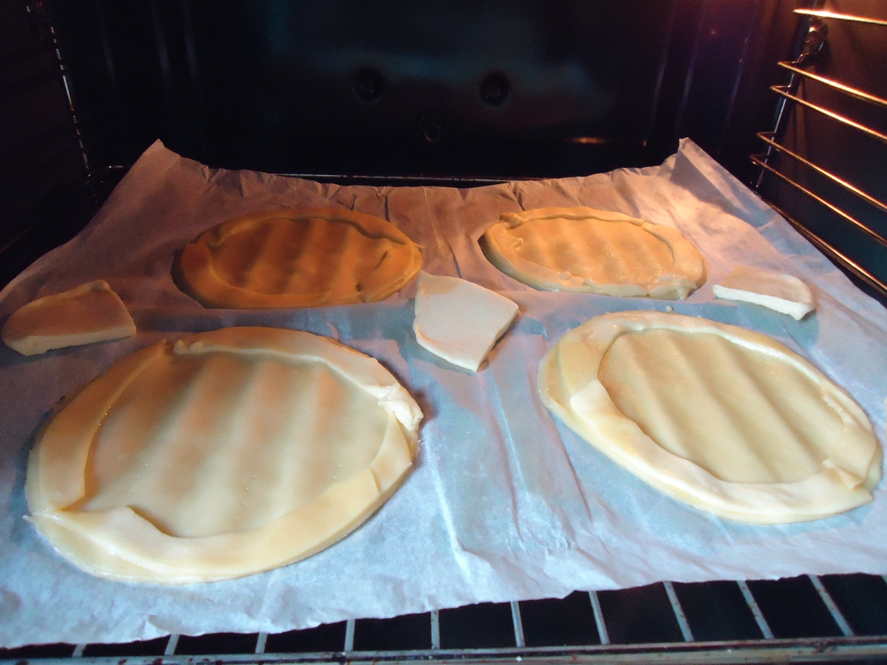 Comment faire : Couper la pate dans des cercles puis la mettre dans le four pour quelques minutes pour le laisser grandir un petit peu. Après il faut mettre du pesto, des tomates et herbes et à la fin la mozzarella. Les mettre dans le four pour ~15 minutes de 180°.