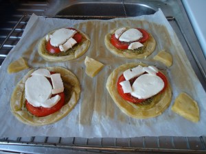 Blätterteig auf ein Blech ausbreiten, anpieksen und einige Minuten in Backofen, dass er ein bisschen aufgeht. Dann mit Pesto bestreichen, geschnittene Tomaten und Gewürze drüber, mit Mozarella bedecken und in den Backofen für ca. 15 Minuten.