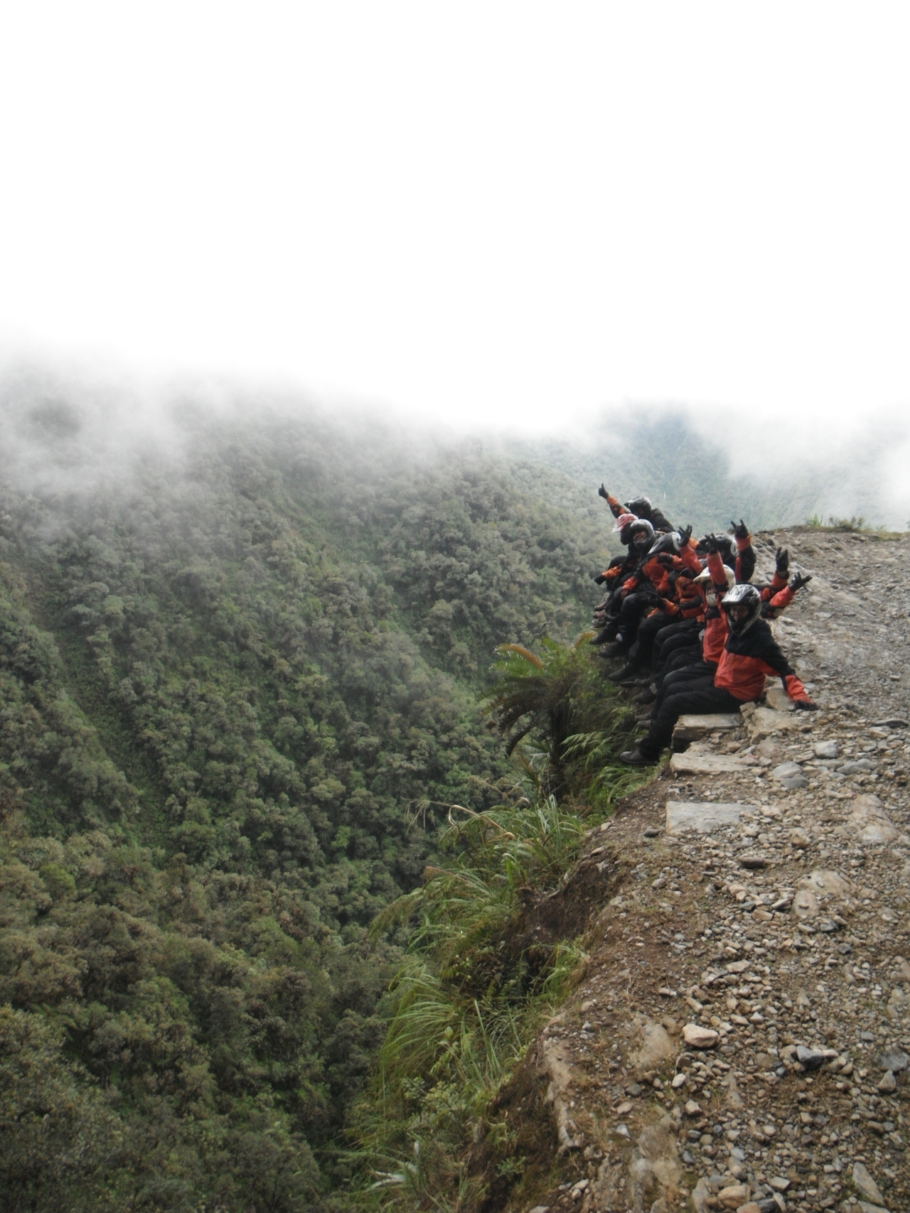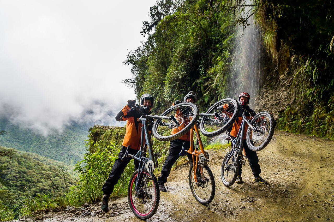 Die „Camino de la Muerte“ per Fahrrad! Die Straße von La Paz aus runter in den Dschungel wurde früher viel genutzt um beispielsweise Früchte aus der Selva in die Stadt zu transportieren. Da die Straße (Schotter-Feldweg-Piste würde es besser treffen) nur einspurig ist, aber in beide DSCF7225Richtungen genutzt wurde, kam es häufig zu Unfällen. Diese waren wegen dem bis zu 500m Abhang zu einer Seite häufig ziemlich tödlich. Daher der Name „Death-Road“.