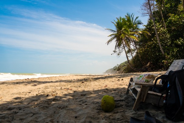 Nach ein paar Tagen im dortigen Paradies wollten wir dann endlich einen Traumstrand sehen. So brachen wir wieder nach Santa Marta auf, von wo wir „direkt“ einen Anschlussbus nach Palomino bekamen. Direkt heißt: Wir fragen den Fahrer unseres Collectivos (hier ein Jeep, der zwischen Minca und Santa Marta pendelt), von wo die Busse nach Palomino fahren. Drei Sekunden später fängt er wie wild an zu hupen, wuchtelt mit seinen Händen und schreit laut aus dem Fenster. Auf der gegenüberliegenden Straßenseite hält ein vorbeifahrender Bus. Unser Fahrer schnallt das Gepäck vom Dach und wünscht uns eine schöne Weiterreise. Wir steigen in den Bus, der mit uns weiter Richtung Norden fährt. Wie für Südamerika typisch ist nicht nur ein Huhn dabei, sondern ein ganzer Karton kleiner fiebsender Küken.