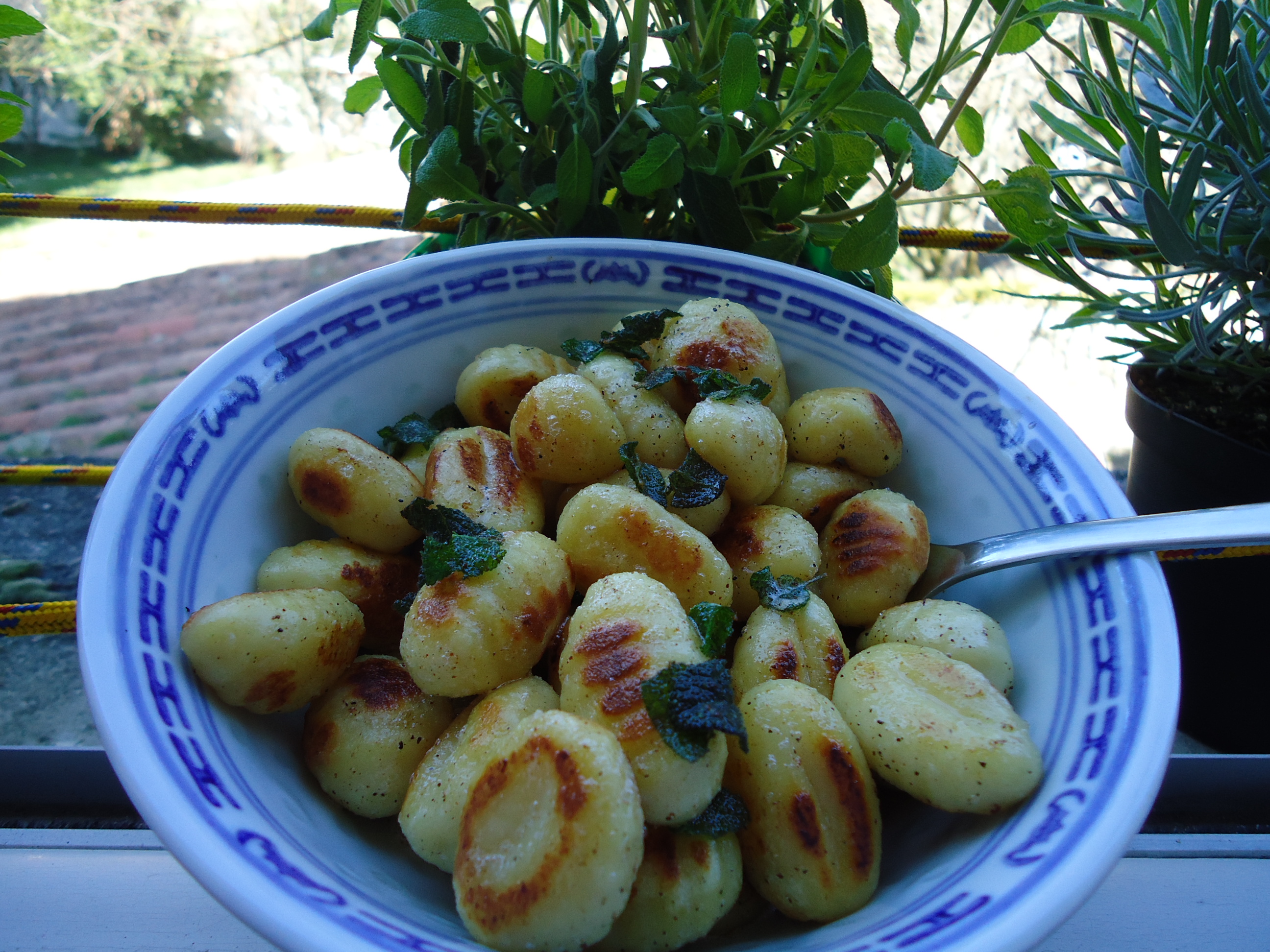 Bouillir les gnoccis ou les laisser sauter dans un poêle. Chauffer beurre et ajouter des feuilles de sauge coupés et laisser devenir craquant sous petit feu. Ajouter sel et poivre et le manger avec les gnoccis.