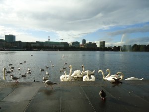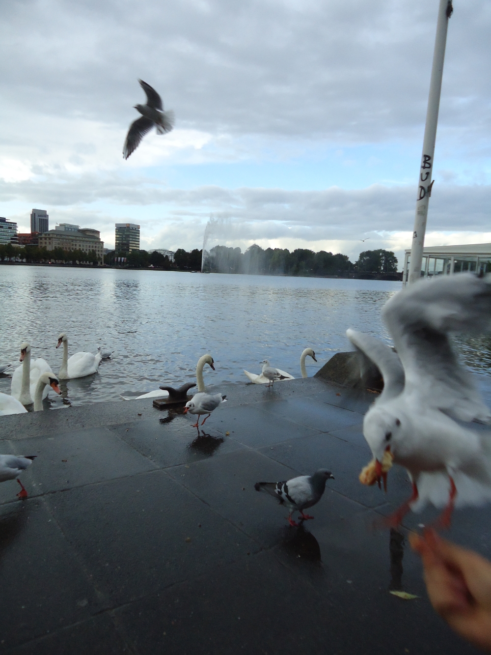 Mit etwas volleren Taschen führte uns unser Weg durch die Stadt zur Binnenalster, ein großer See in Hamburgs Mitte. Dort fütterten wir ein paar Möwen, bis Schwäne dazukamen, und die Zahl von Beiden in kürzester Zeit exponentiell (ohoo, Mathe Brückenkurs :P) Anstieg. Fast mussten wir aufpassen, nicht selbst angeknabbert zu werden =D
