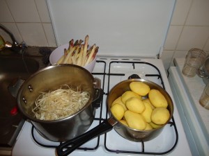 Den Spargel und die Kartoffeln schälen und kochen lassen, bis sie weich sind.
