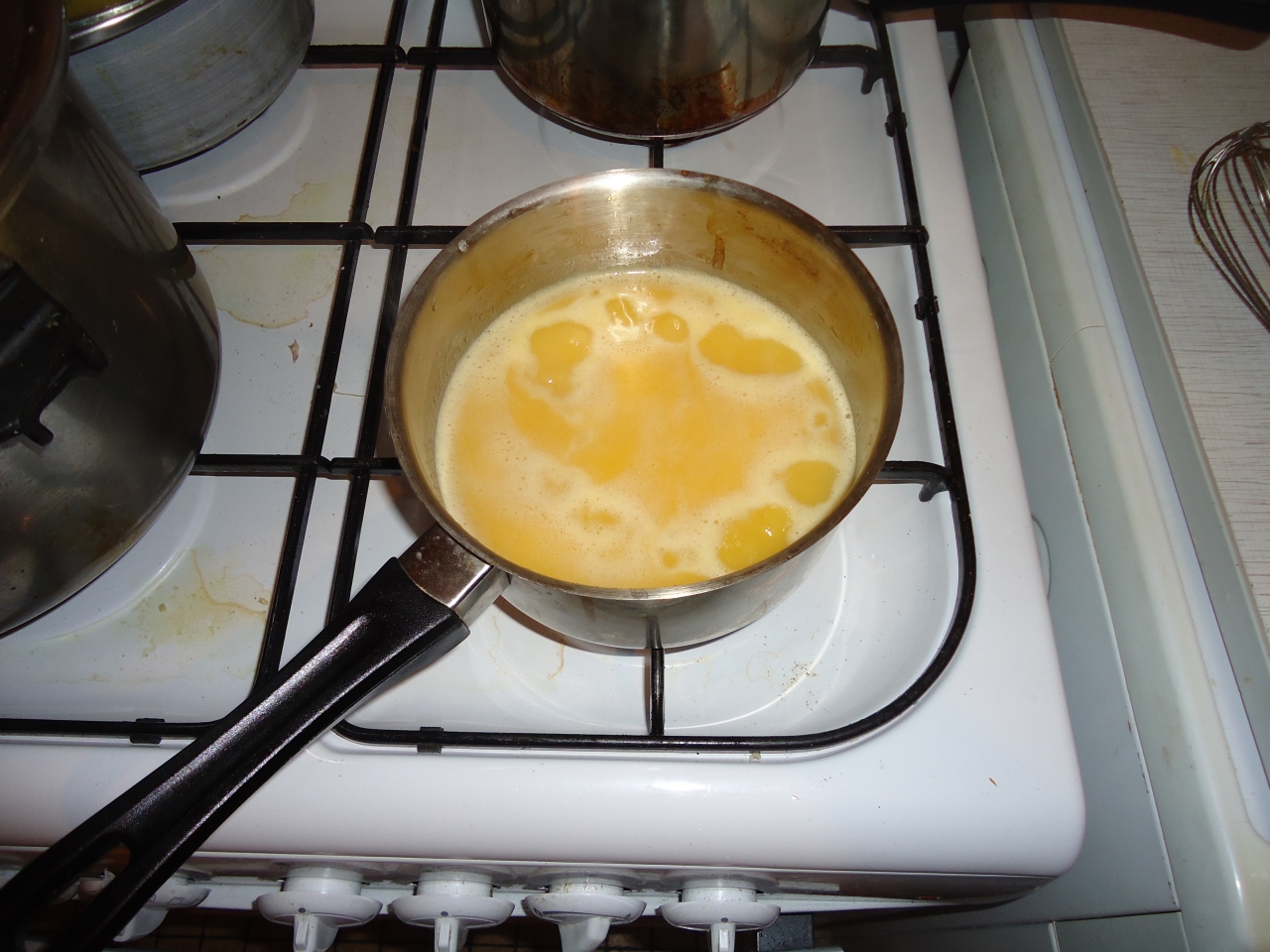 Für die Sauce Hollandaise die Butter bei geringer Hitze schmelzen lassen. Den Orangen –und Zitronensaft dazugeben und aufkochen lassen. Topf von der Platte nehmen, 1 Ei